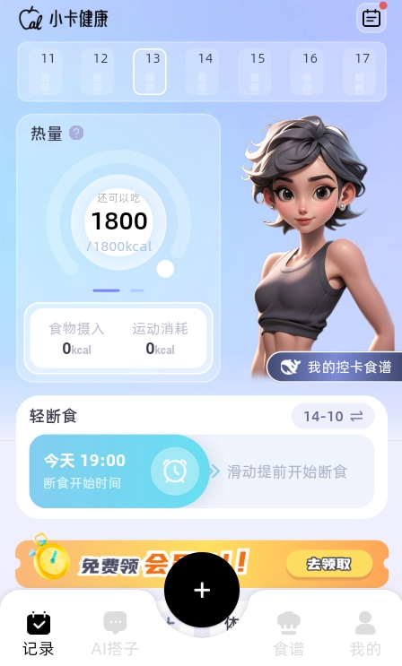 打开小卡健康应用后,进入记录首页界面,就能看到自己之前设定好的计划内容。
