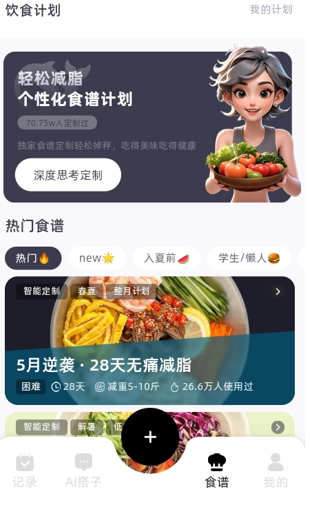 能自动为您计算在不同阶段、不同健康目标下的个性化热量摄入情况,其中包含碳水化合物、脂肪的摄入量以及总热量摄入值。