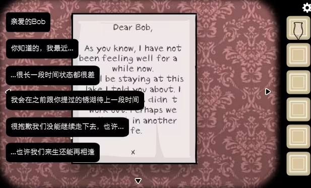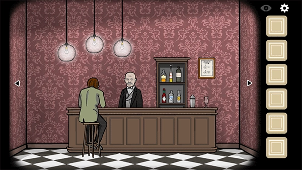 从柜台视角来看:酒保乌鸦先生吩咐我们给坐在柜台旁的鲍勃送上一杯酒。首先点击柜台上的调酒器,接着依据墙上的配方,分别点击伏特加和橙汁各两次,随后点击两次调酒器,这样就能调出一杯螺丝起子鸡尾酒,同时解锁成就“螺丝刀”。把这杯酒递给鲍勃,等他喝下后,他会从嘴里吐出一把螺丝刀。之后拿回鲍勃手中的鸡尾酒杯,再参照《生日》里从祖父上衣口袋里找到的配方,分别点击杜松子酒和汤尼水各两次,然后点击两次调酒器,就能调出一杯琴汤尼,同时解锁成就“锈湖琴汤尼”。最后把这杯酒递给鲍勃,让他喝下。