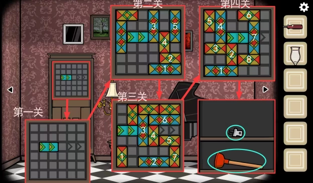 从钢琴的视角来看:点击柜子上方的格子游戏,我们需要把天蓝双格长条向右移动到带有标记的位置。