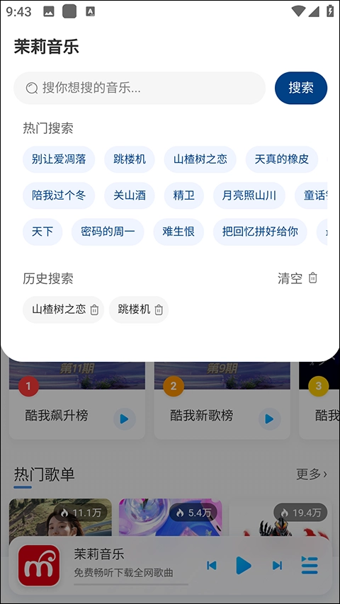 打开茉莉音乐的首页,映入眼帘的是不少热门推荐的歌曲。