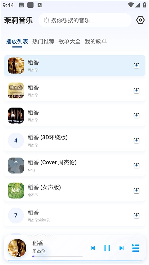 这里我们搜索周董的《稻香》,能看到好几个不同版本的《稻香》。