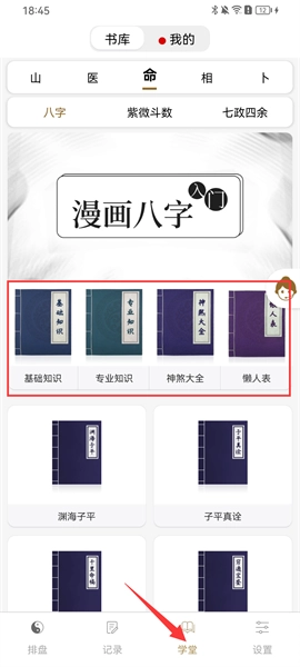 5、点击进入学堂页面,这里有丰富的八字入门漫画与书籍供大家免费浏览学习,即便是新手也能快速掌握入门知识。