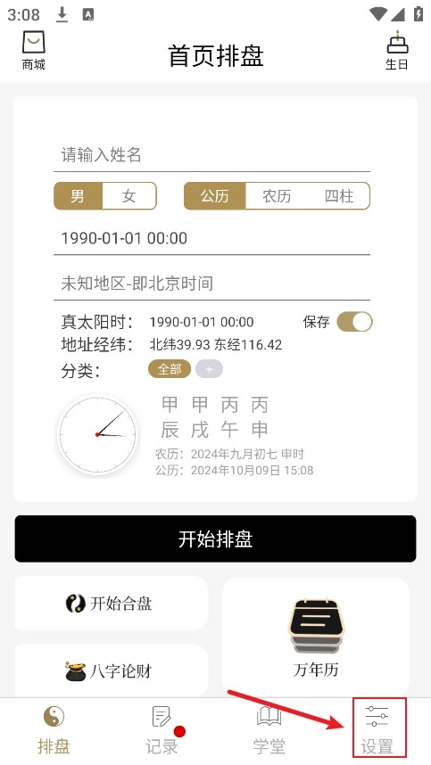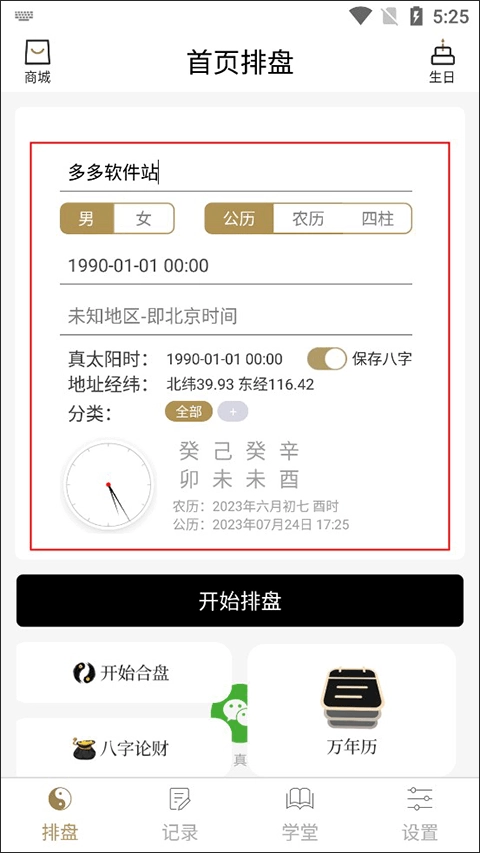 首先我们先进入,在主页我们就可以看见排盘的功能了,我们只需要在圈出来的区域输入自己的信息就可以了,输入好了以后点击开始排盘。