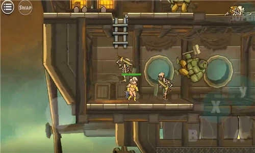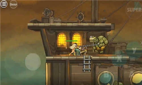 选好角色后,我们的闯关之旅就正式开启啦!游戏采用虚拟摇杆操作,左边是控制上下左右的按键——因为是虚拟设计,所以不会显示出来哦。小编玩了一会儿发现,虚拟摇杆的手感还挺特别的,而且按下盾牌键就能下蹲防御,这可是后续关卡的必备操作呢,毕竟蹲下是抵挡那些不明飞行物最有效的办法。A键是攻击键,B键负责跳跃,还有带CD的大招可以释放。用这几个按键组合起来打怪,体验真的特别顺畅!刚开始会遇到左右两边同时出现怪物的情况,想要不掉血,就得看操作配合得怎么样了——可以跳到一边集中攻击,也能快速打完左边再转去右边,反应速度可是关键哦!