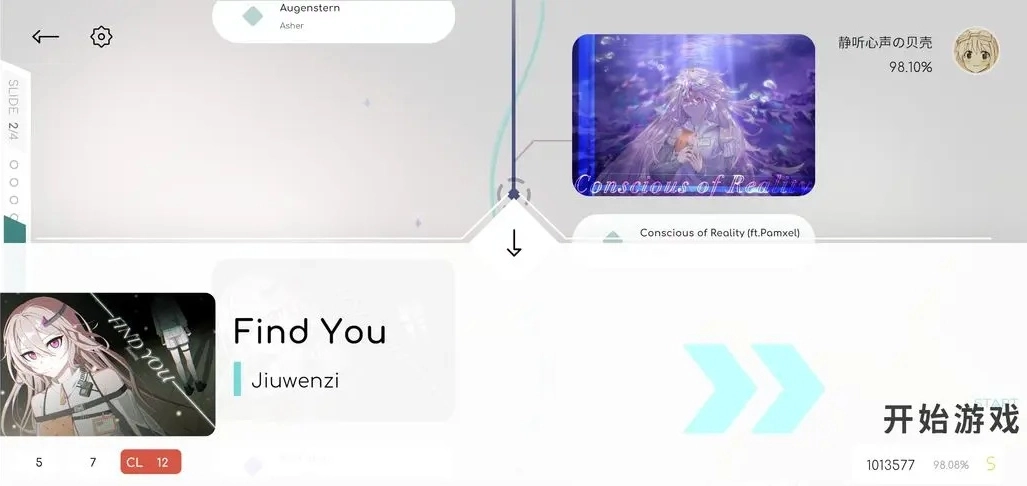 上下滑动并点击曲绘即可选定曲包,左下角的本章进度是该曲包内所有曲目的最高准确率平均值,若某首曲目未游玩过,其准确率将记为0%。