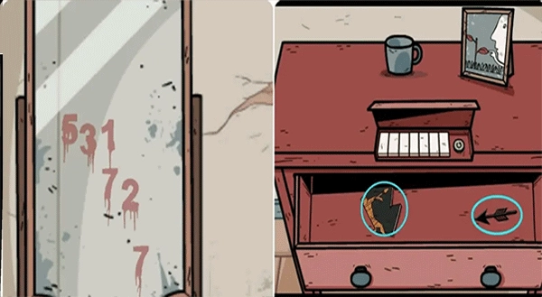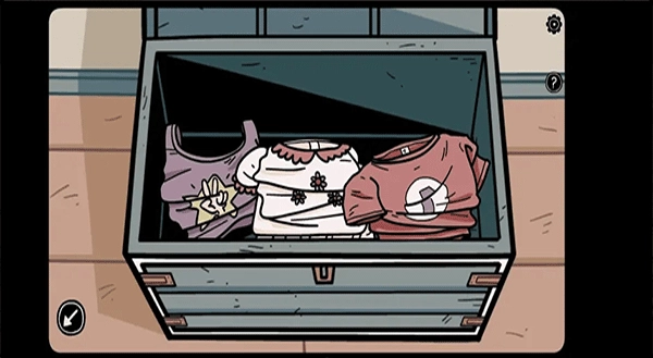 7、留意箱子内衣物上的图案(右侧为1、左侧为2、中间为3)以及衣领处的标签(三个符号),接着按照顺序排列这些符号,就能打开之前得到的黄色笔记本了。