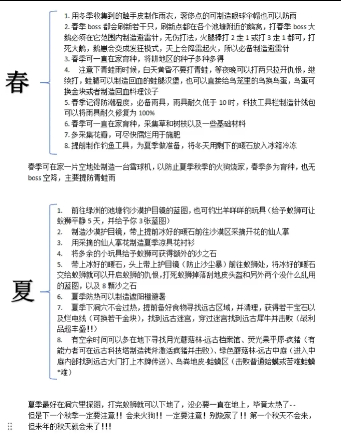 1、基础资源优先级必备四件套:燧石(10块以上)、树枝(40根以上)、草(80份以上)、木头(20块以上),这些材料主要用来制作斧头、鹤嘴锄等工具以及火把。食物应急方面,建议沿路收集浆果和胡萝卜果腹,注意不要吃生的怪物肉,以免掉血。