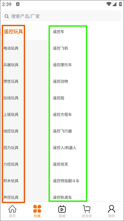 在首页顶部的功能区域里,找到“分类”选项并点击,这样就能进入商品分类界面了。系统对商品的划分采用“大类 + 小类”的双层结构,就像红色方框所标注的“益智玩具”属于大类,绿色方框标注的“拼图积木”属于小类一样。