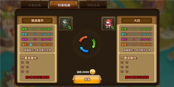 【时装转换】功能仅支持相同部位的时装之间进行相互转换。转换完成后,两件时装的所有属性会直接互换,且整个过程仅消耗少量金币。