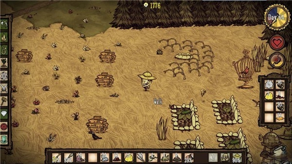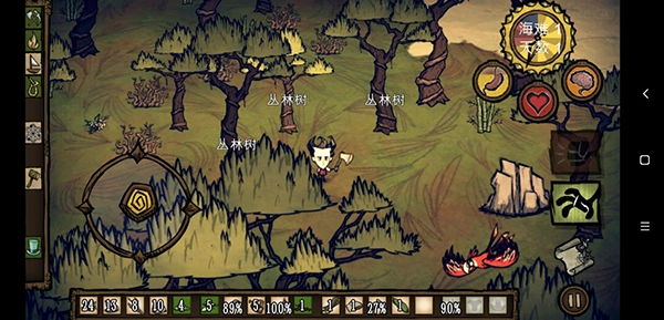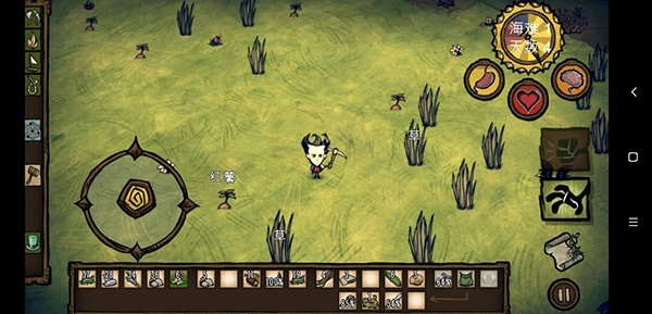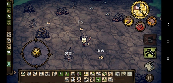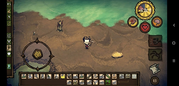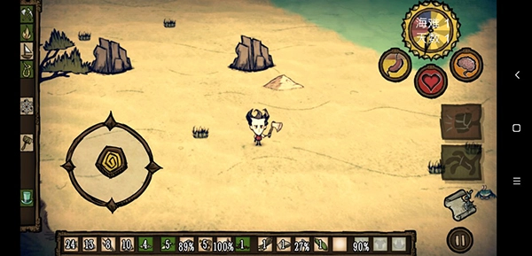 生命值、饥饿值和精神值初始状态均为满值。在这个阶段,玩家无需过多操心,既不会遭遇天灾,也不会受到野狗和Boss的侵扰。
