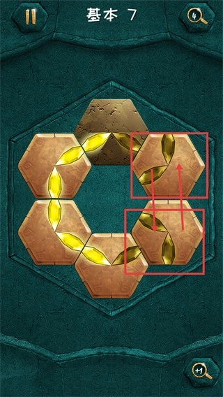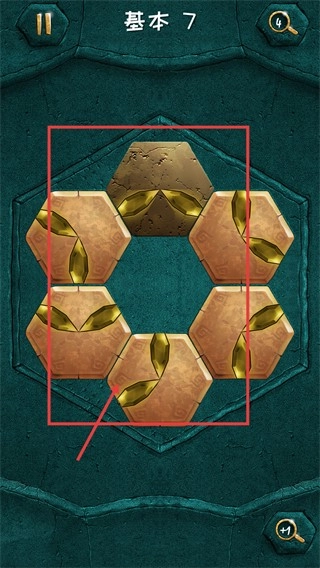 进入【基本-7】关卡后,留意红色框选区域内的拼图块排列方式,需要对这些拼图块进行调整,使金色纹路相互衔接,以此推动关卡进度。