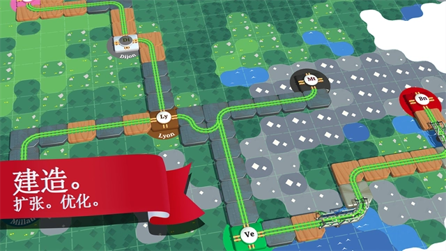 游戏的关卡挑战以地区为划分依据,玩家需要在当前地区积累足够金币来获取铁路方块奖励,而只有收集到足量方块铺设好通往相邻地区的铁路,才能解锁并进入下一个关卡区域继续挑战。这种需自行铺设道路的关卡设计让小编感到十分新颖,更有趣的是,玩家能根据个人偏好规划不同路线前往各个站点——这意味着关卡之间不存在固定的先后顺序,完全由玩家自主决定优先挑战哪个站点。