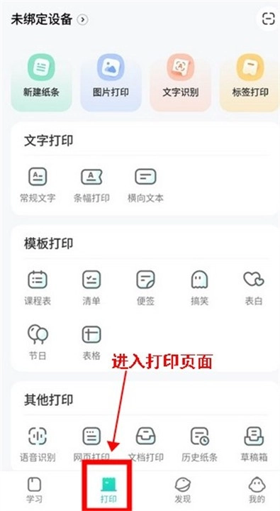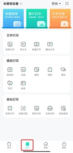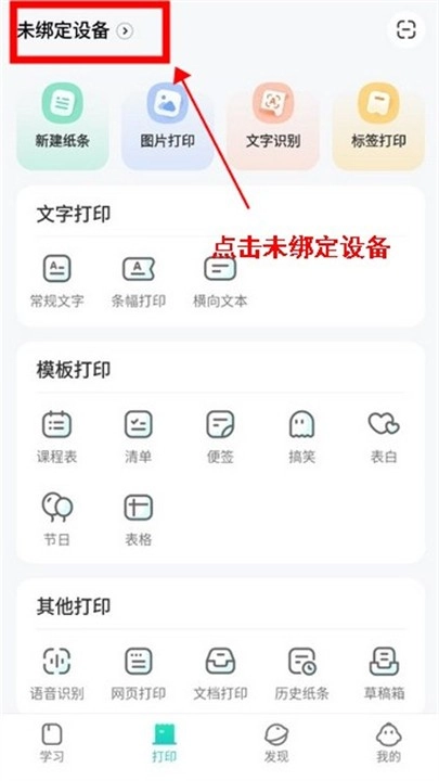 用户进入打印页面后,可点击左侧的“未绑定设备”选项。