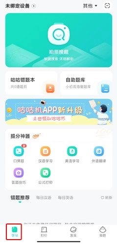 学习页面:这个页面具备丰富多样的功能,像拍照搜题、咕咕错题本、自助题库都包含在内,另外还有针对其他科目的提分工具。