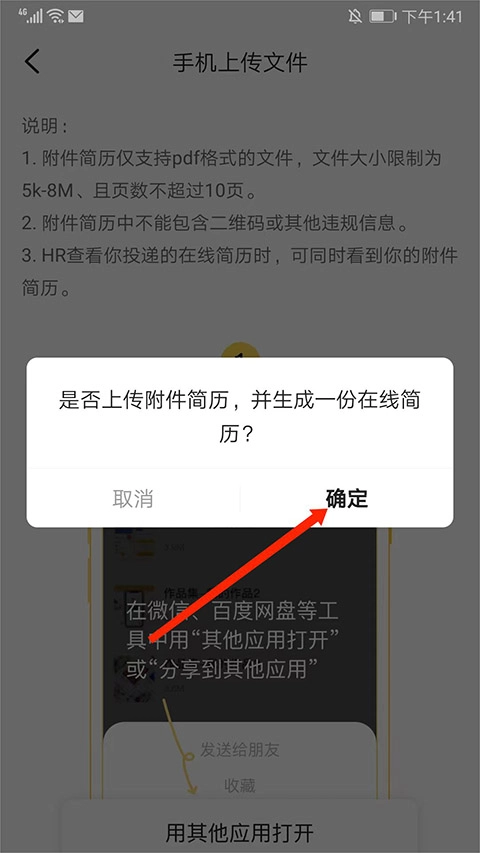 当出现“是否上传附件简历,并生成一份在线简历”的提示时,点击“确定”选项。