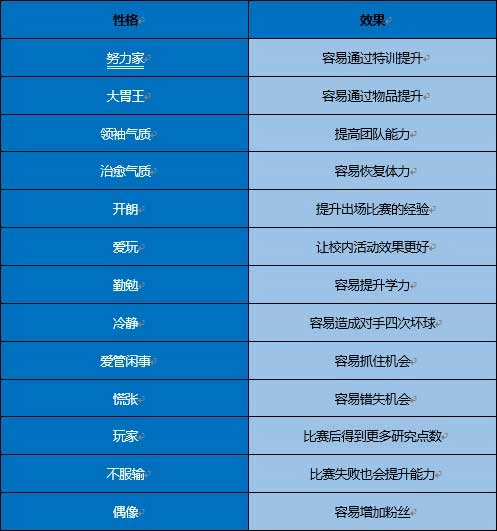 在游戏里,每个学生都具备一种性格特质,而这些性格特质会对运动员产生各异的影响,具体情况可参考下图:
