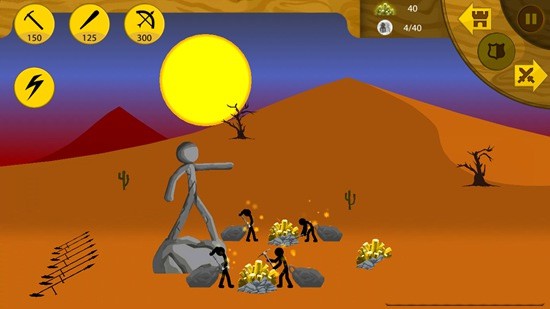 1、首先第一件事就是获取资源,我们点击屏幕左上角的“锄头”按钮,可以召唤出挖矿的火柴人,它们拖着大包来挖矿,然后我们可以获得更多的矿石召唤战斗类的火柴人。