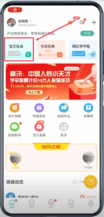 打开掌心宝贝家长版后,在校园页面中点击宝贝在线。