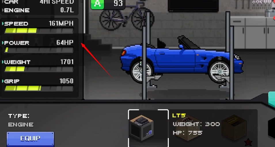 3、这个面板用于调整你车辆的输出,并非数值越大效果就越好。属性面板上的英文对应的含义分别是:SPEED代表速度,POWER代表功率,WEIGHT代表重量,GRIP代表抓地力。