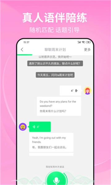 真人在线对话:依据等级匹配对应的语伴,开启英语互动交流;答题PK:连线小伙伴较量单词储备与英语知识!