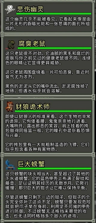 【特殊任务】悲伤幽灵随机刷新在2-4层,分别对应腐臭老鼠(水边打)豺狼诡术师(尽量近战,掉落投掷武器)巨大螃蟹(防御强,伏击或直接找条水少的路放火放毒,掉落肉),为了防止被夹击可以先清一遍怪再点幽灵接任务。任务完成后可选择一件武器或者防具。也是神器玫瑰的前置任务。