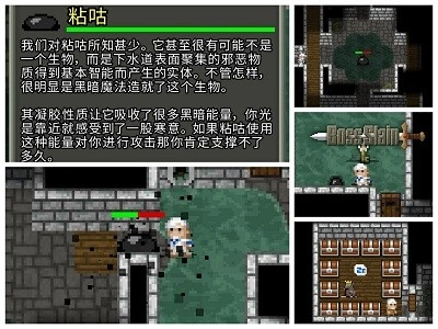 【BOSS】粘咕,第一个BOSS,可喷腐蚀淤泥,在水中可回复血量,住在5层房间中间的一个污水池中。冒险者被发现后触发“背水一战”,无法离开本层,无法使用传送卷轴。站在水里打它,开始飘黑花花的话就躲远点再打。死后掉落钥匙和粘咕球。