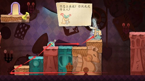 1、依据教学指引,把蓝色方块向左拖动,触发剧情并与爱丽丝对话后,爱丽丝会进入镜子之中。