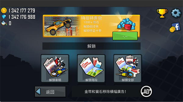 7、在游戏商店中,还可以用金币或钻石解锁各种车辆地图一键全部解锁,让你的车库更多、更酷。