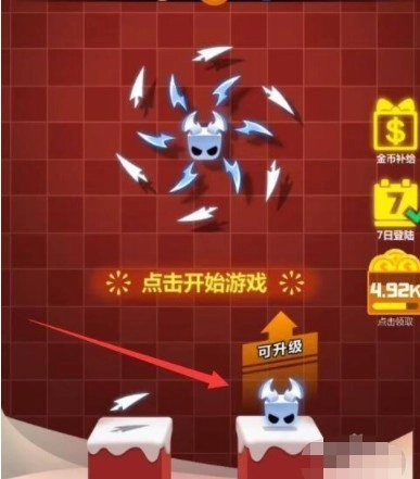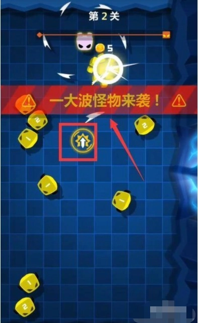 3、当屏幕提示即将有大量怪物袭来时,我们可以吃掉那个向上箭头形状的暴走道具,这样飞刃就会进入高速旋转状态,从而能够抵御大批怪物的进攻。