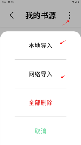 2、然后系统会自带部分的书源,如果觉得这些不够的话可以点击右上角,里面支持本地导入和网络导入