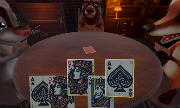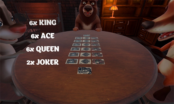 回合开始时总共有20张牌,包括6张Q、6张K、6张A以及2张小丑,这些牌会随机分发给参与者,每人能得到5张。