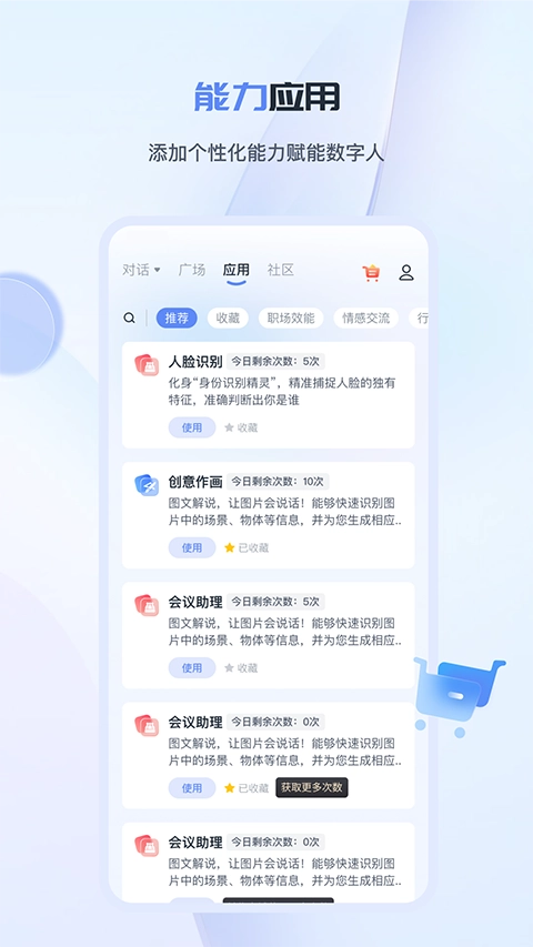 能力超市:工作数字人应用会依据用户的行业特性,配备丰富的专业服务选项,像写作、绘图、视频创作以及行业报告等都涵盖其中。用户能够按照自身需求绑定对应的服务,以此为自己的数字人赋予更多能力,进而提升工作效率与专业素养。