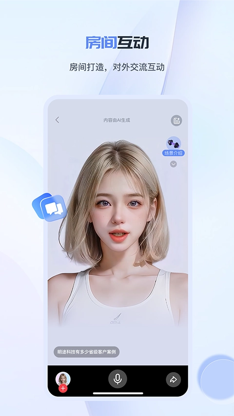 房间互动方面,数字人配备专属的虚拟房间应用,用户能够借助该应用搭建对外服务平台,并将房间分享给其他用户访问。这一功能有利于提升数字人在外部场景的服务营销效能与影响力。