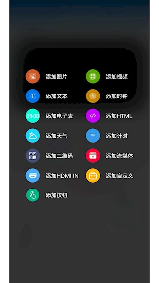 添加节目内容的操作步骤如下:点击编辑区域右下角的加号图标,即可添加视频、图片、文本等不同类型的素材,同时还能对素材的显示区域和播放特效进行设置。