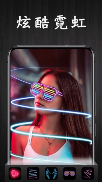 【霓虹特效】可为您的照片增添霓虹灯样式的效果,包含圆形、方形、三角形、螺旋等多种形态。