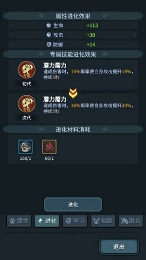 4、查看进化后出现的属性变动情况,进化材料需消耗各自对应的精华与巨心。