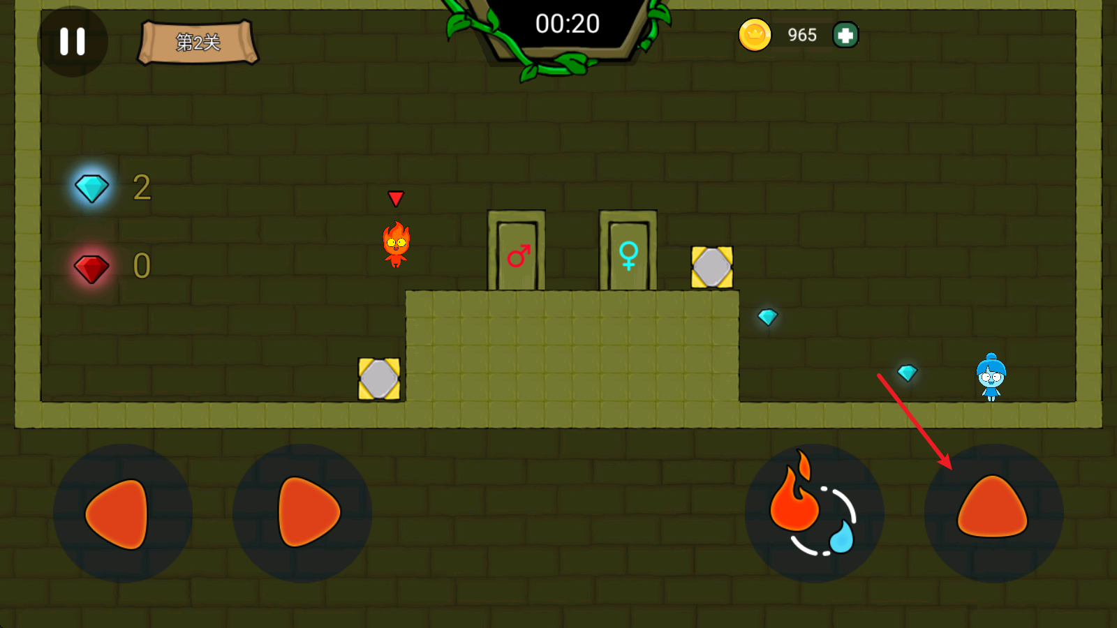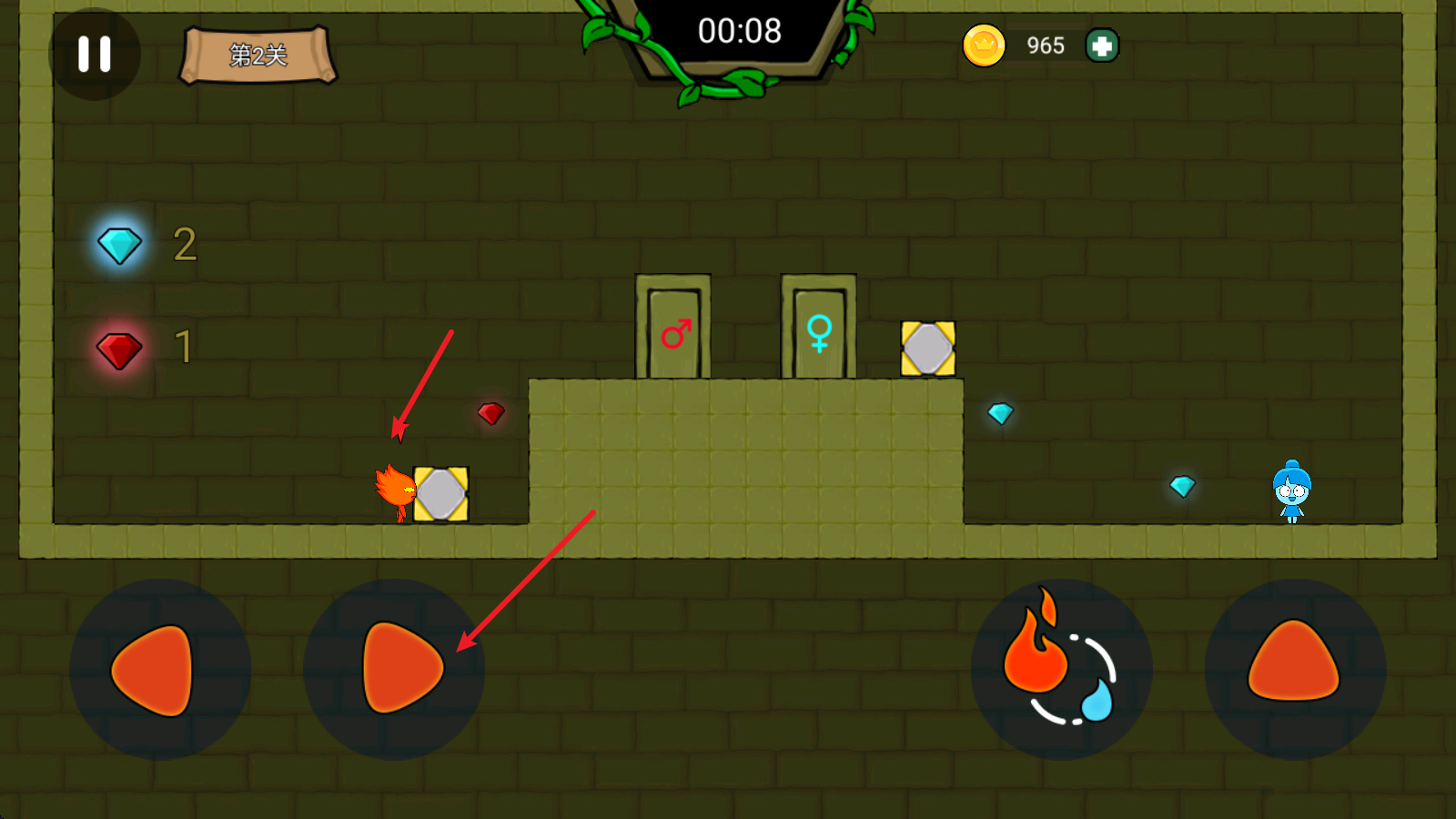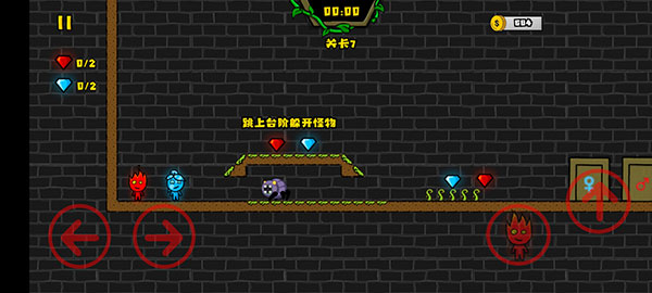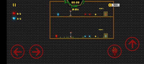 4、过程中我们需要利用冰火人互相的配合进行闯关,例如一人开启机关,另一人则趁机通过。