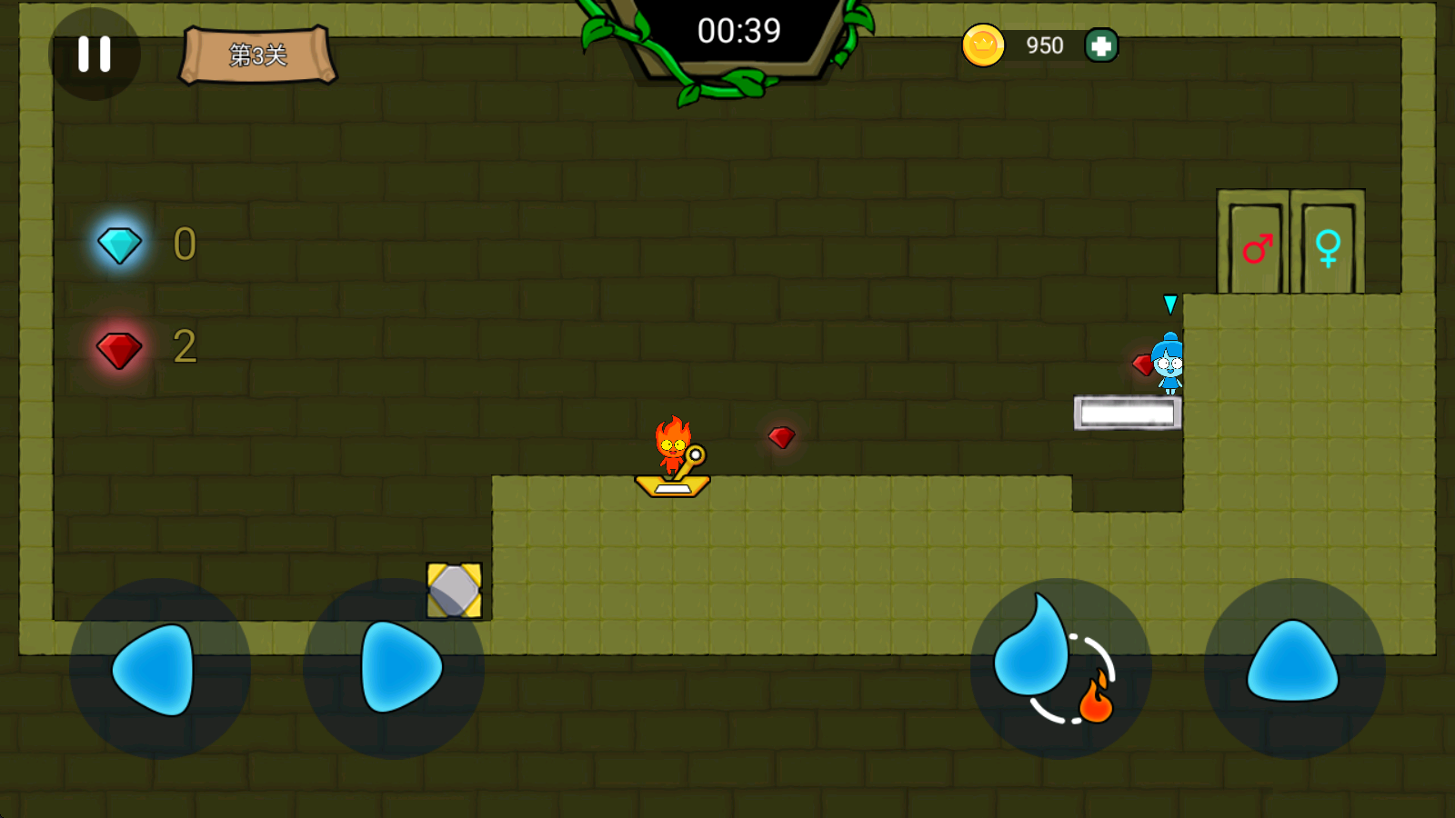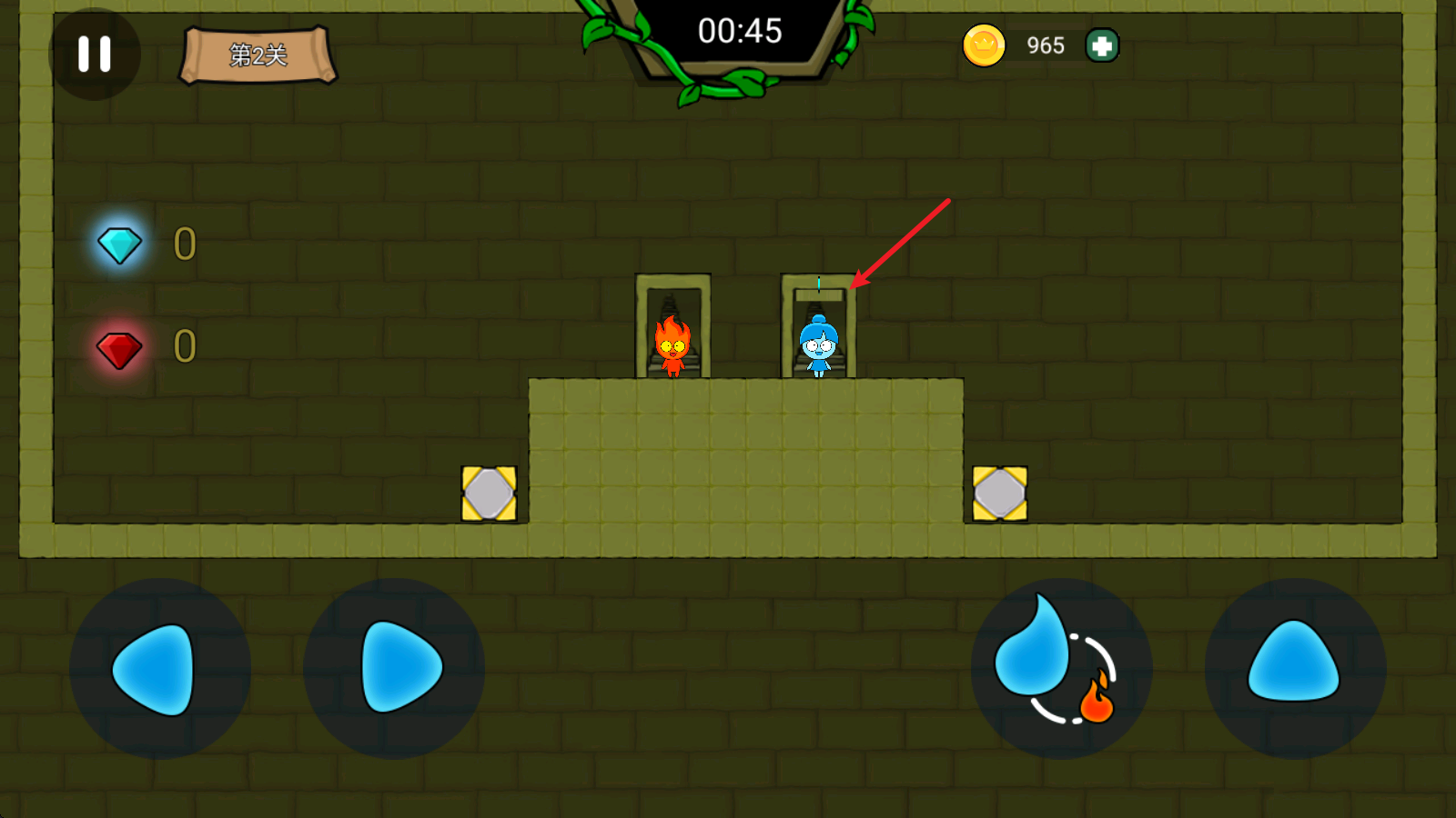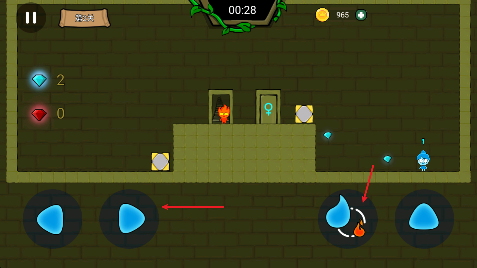 4、过程中我们需要利用冰火人互相的配合进行闯关,例如一人开启机关,另一人则趁机通过。