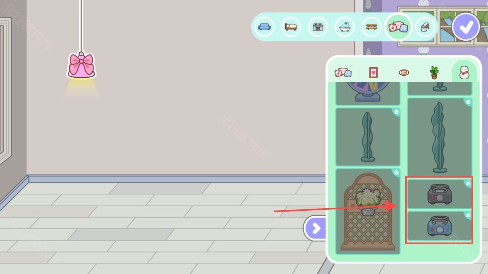 6、上锁家具需要观看广告才能解锁,建议优先解锁【饰品】栏目最下面的两个装置,黑色装置可以下雨,蓝色装置可以下雪。