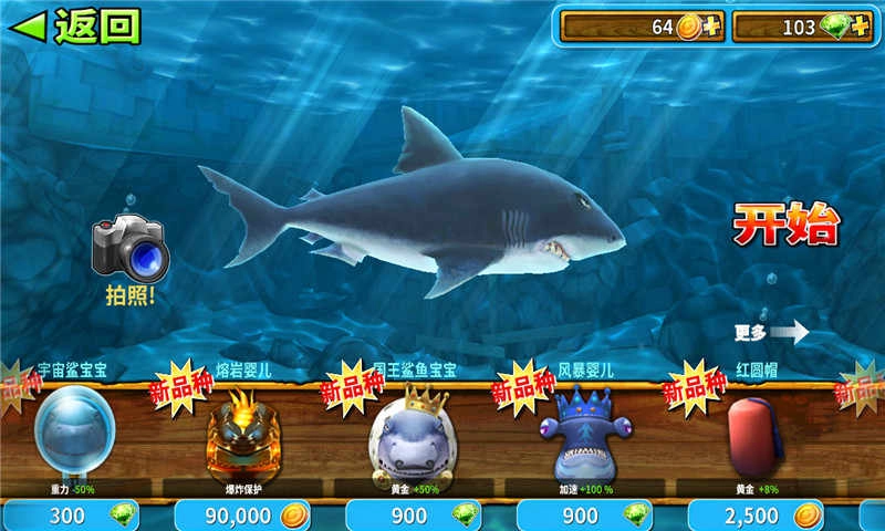 多种鲨鱼种类,每种鲨鱼都拥有独特的特点和能力,让玩家体验不同的游戏乐趣。