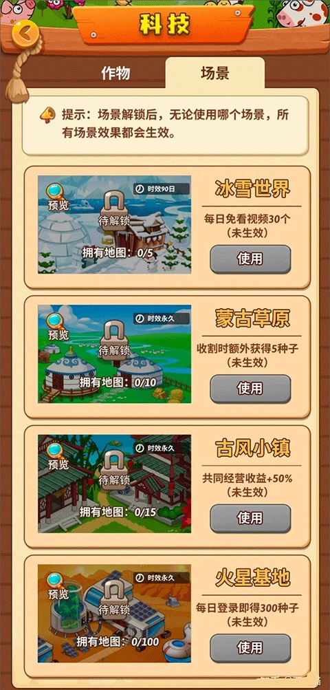 6、场景效果:,海滨农场,(作物全体收益加倍)冰雪世界(每日30个)蒙古草原(收割时额外获得5种子)古风小镇(共同经营收益+50%)火星基地(莓日登陆即得300种子)