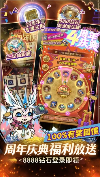 四周年庆典七日登录福利活动开启!每日登录即可领取8888钻石与四周年专属纪念称号,连续签到还能解锁神话魔法罐等丰厚奖励!