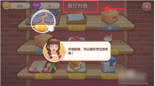 5、其中还可以进行【餐厅升级】,其中花费金币解锁【煎饼锅】,可以加快食物的制作,【煎饼油纸】可以放更多食物