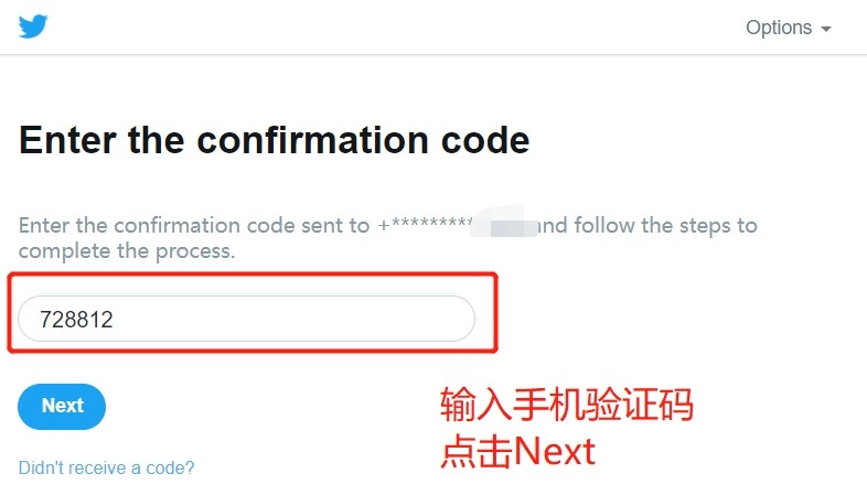 4、这个时候我们会收到 twitter 发来的一条验证短信,把验证短信填写到验证输入框中,在下一步,这个时候账号就算注册成功了。
