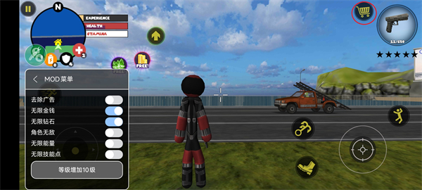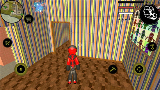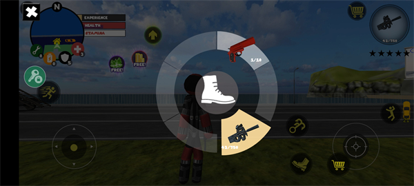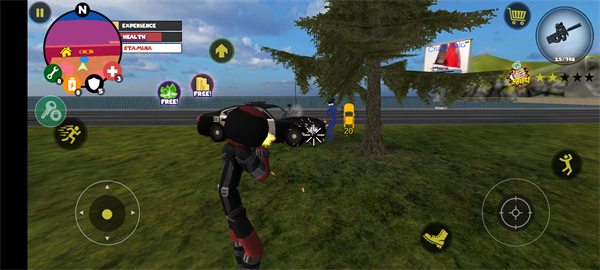 左侧移动、加速,右侧绳索,攻击(跳跃),跳跃,右上侧的武器更换以及血量、经验的显示都实时更新,一览无遗,凭借着大家自由的玩法,与其他帮派的人物进行交火,期间杀人能够获得经验,杀多了会产生星级,警察和其他附近角色会特殊照顾你对你展开火热的进攻,而如何存活,如何将其他人物击杀则是你所需要完成的任务。