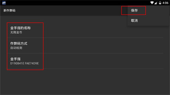 2、然后自定义设计一个金手指名称、输入金手指作弊码,点击右上方保存。