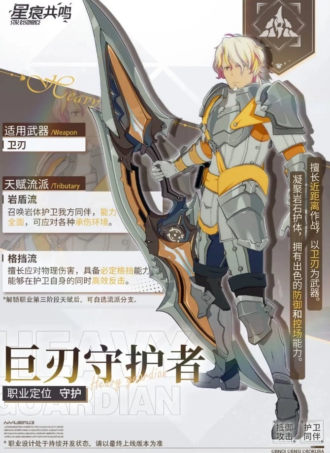 守护型职业。在团队作战时,巨刃守护者肩负着抵挡敌人攻击、守护同伴的关键任务,要时刻留意敌人的攻势并主动做出反应,为同伴营造安全且有利的输出条件。