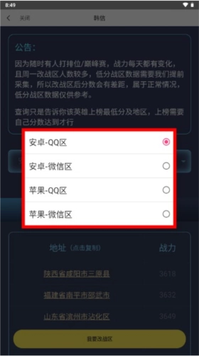 打开王者荣耀战力查询系统,先选择QQ区或微信区,再选择安卓或苹果系统,即可查询到你想了解的英雄的最低战力。