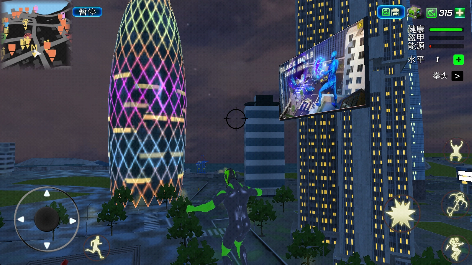 玩法自由度极高且极具挑战性,玩家得借助角色的特殊能力在城市里自由移动,搜寻并制服犯罪分子,守护城市的安全。